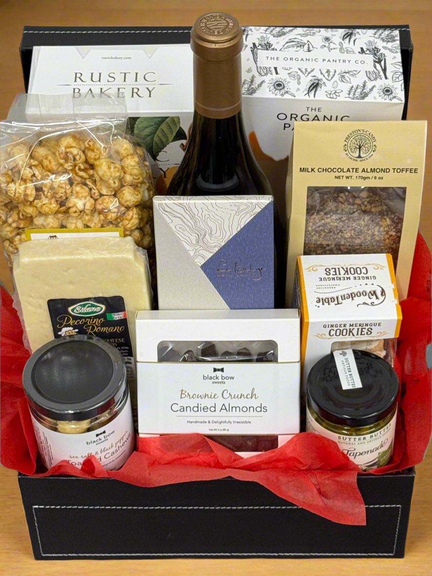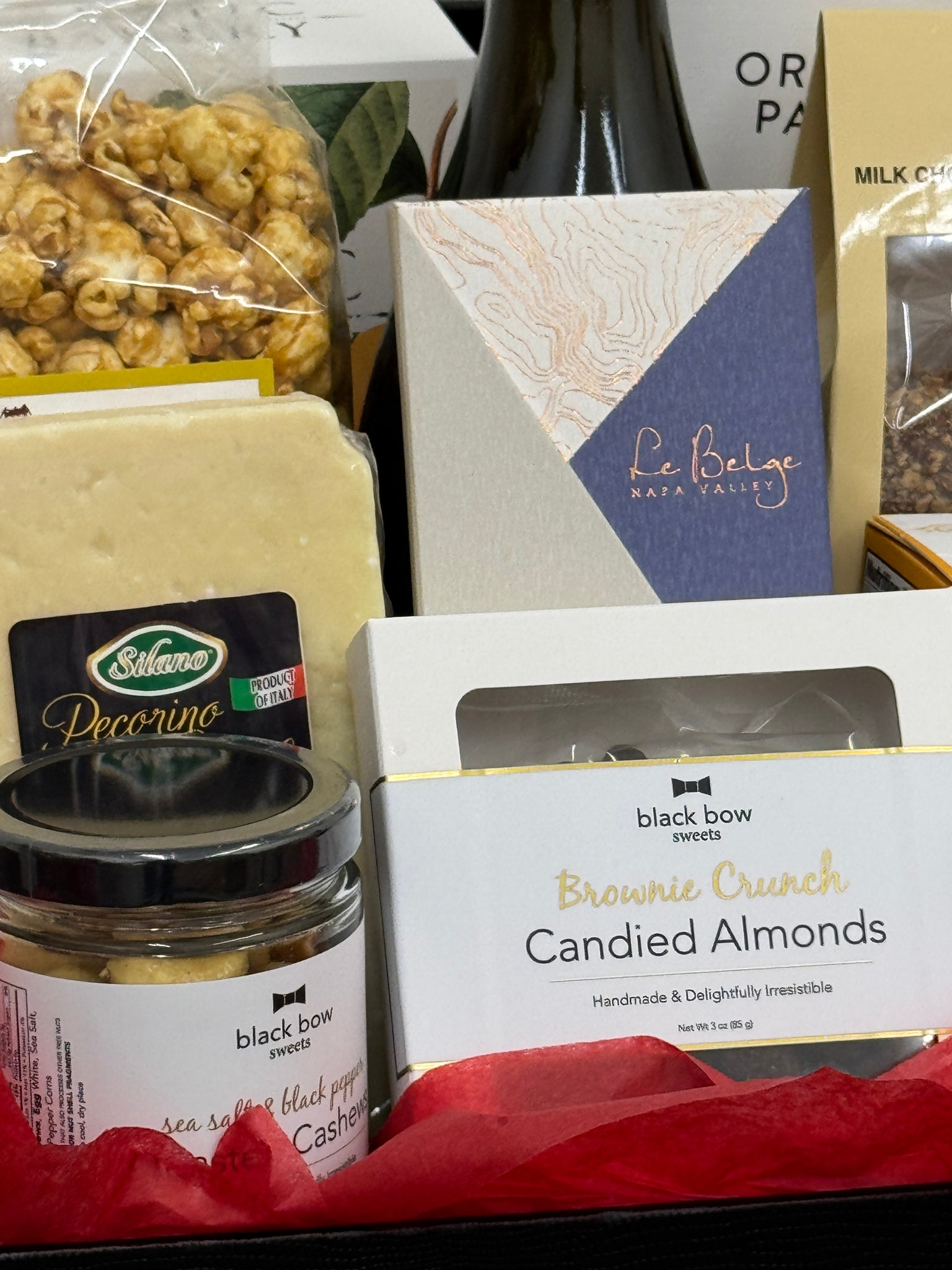 This elIndulge in the exquisite flavors of The Ultimate Flavor Feast. This elegant gift basket is perfect for the holidays, featuring high-end Napa wine, gourmet cheese and crackers, olive tapenade, candied almonds, sea salt candied cashews, chocolate brittle, salami, gourmet popcorn, and more. Satisfy your taste buds with this delectable selection.