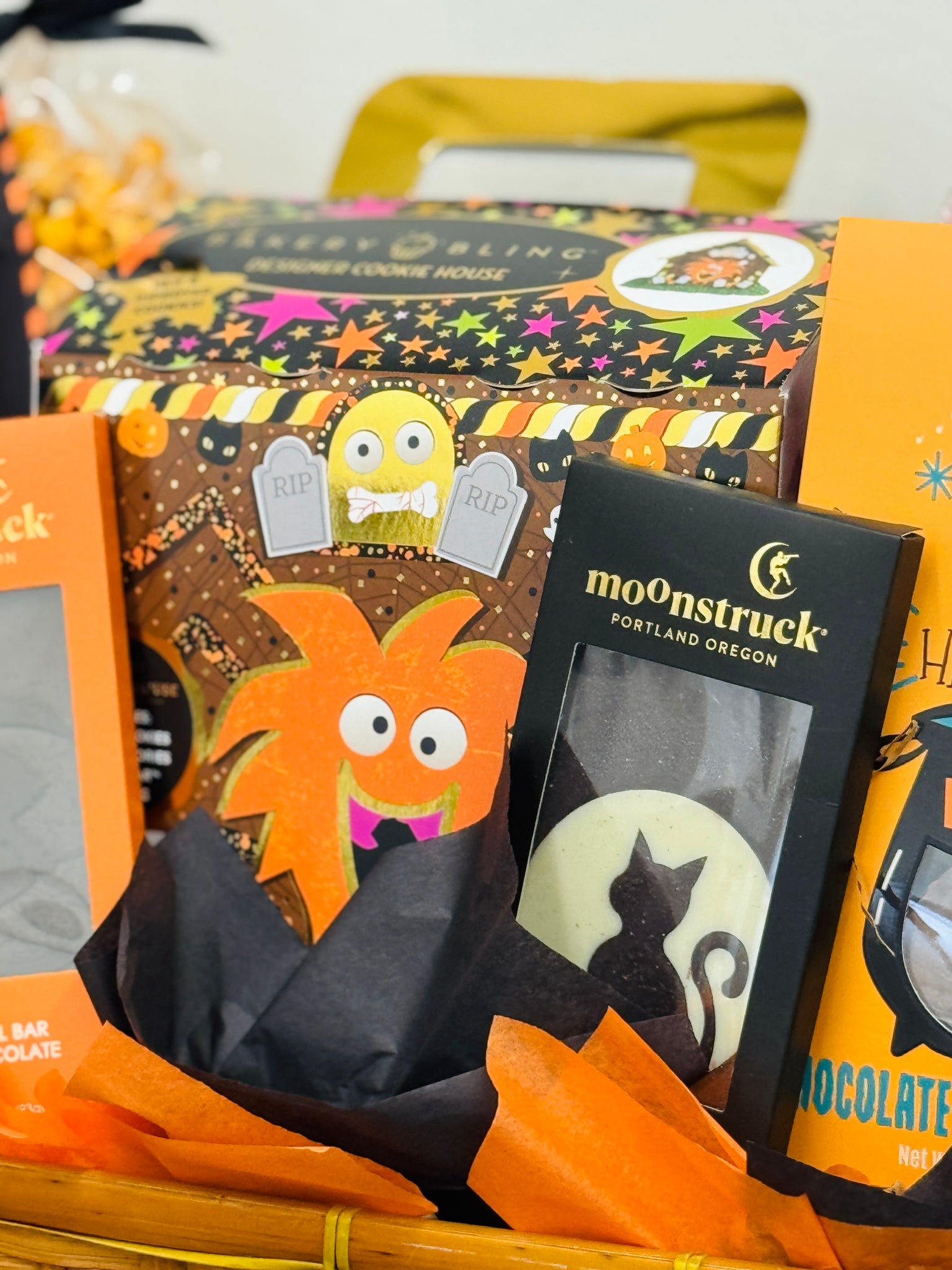 This is a festive Halloween gift basket filled with themed treats and goodies. The woven basket is decorated with orange and black tissue paper and contains a variety of items, including: