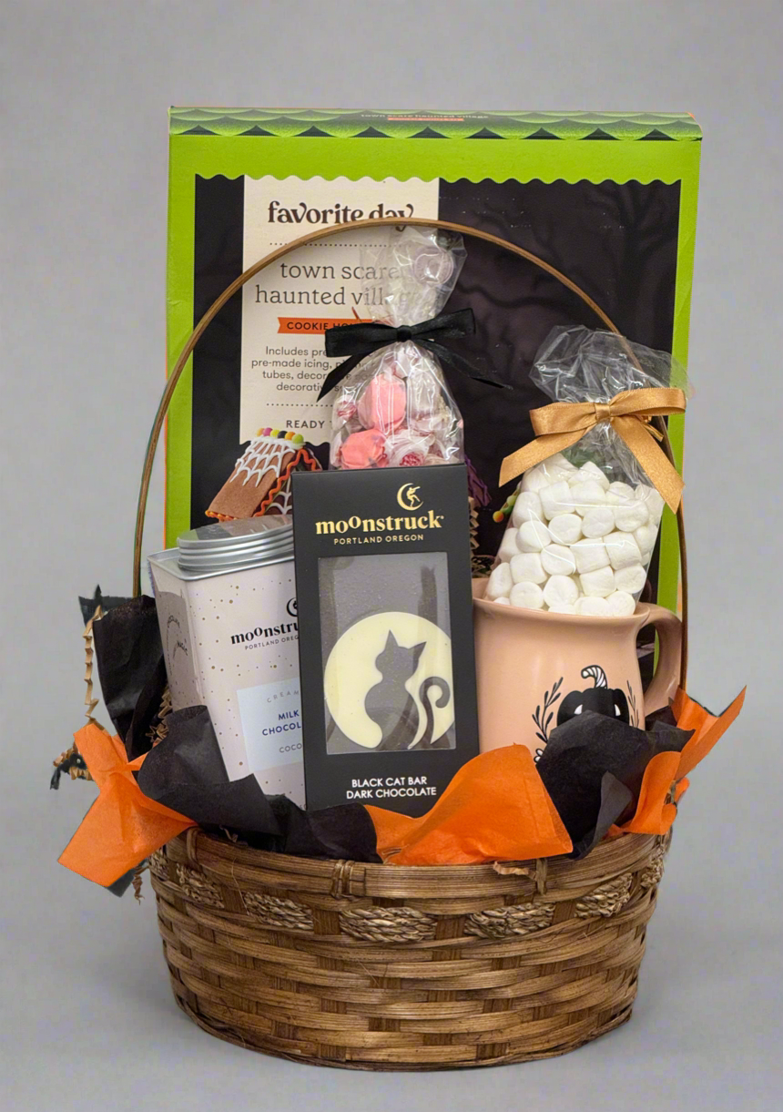 This basket appears to be curated for a warm and spooky-themed night in, complete with hot cocoa, treats, and a fun cookie-decorating activity.